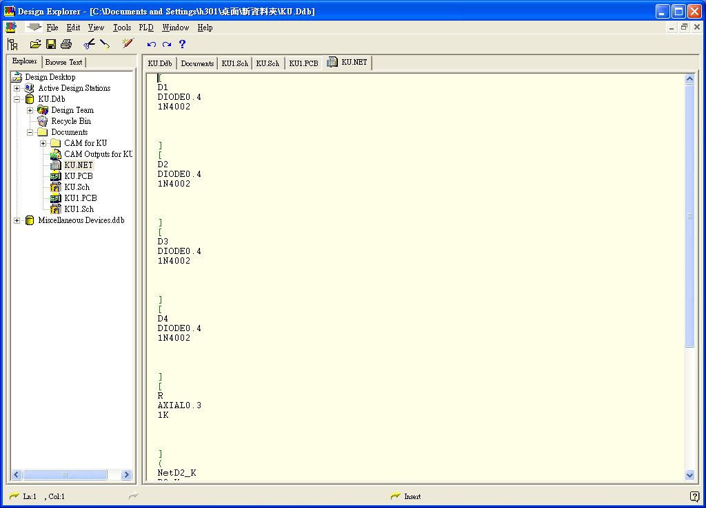 檢查結(jié)果無誤之后,點(diǎn)選上方主選單中Design選項(xiàng)里的Create Netlist,轉(zhuǎn)換成腳位檔報(bào)表,確認(rèn)剛才所設(shè)定之值有無錯(cuò)誤。所列出之值以元件名稱、封裝名稱、元件型號排序,為PCB布線時(shí)讀取之參數(shù),如圖12。